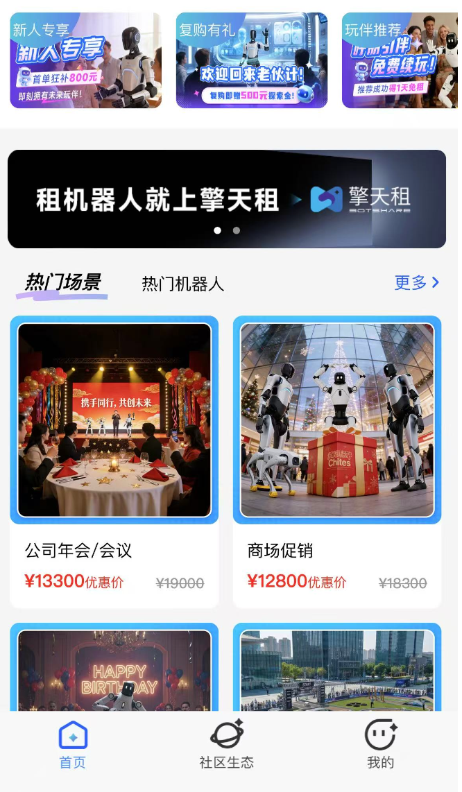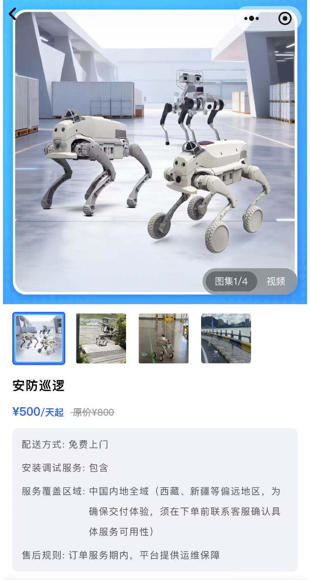 在定价方面,平台通过细化场景和配置,将机器人租赁服务进行产品化与分级,以适应从基础功能到高端定制化的不同市场需求,价格从500元/天-10万元/天不等。