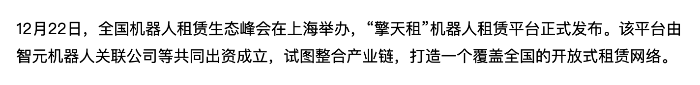 据媒体报道,该平台由智元机器人关联公司等共同出资成立,试图整合产业链,打造一个覆盖全国的开放式租赁网络。