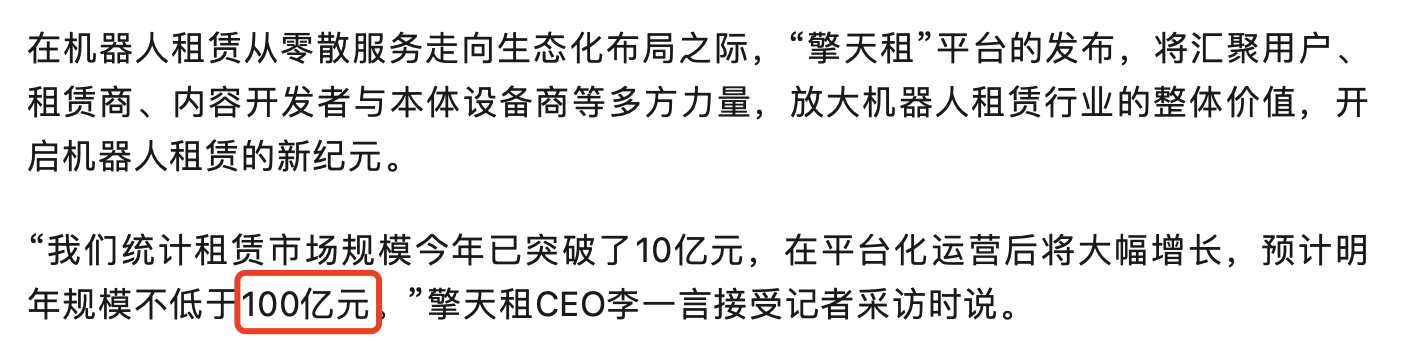 擎天租CEO李一言表示,“我们要做机器人领域的‘滴滴’,更要实现共享充电宝级的便捷。”